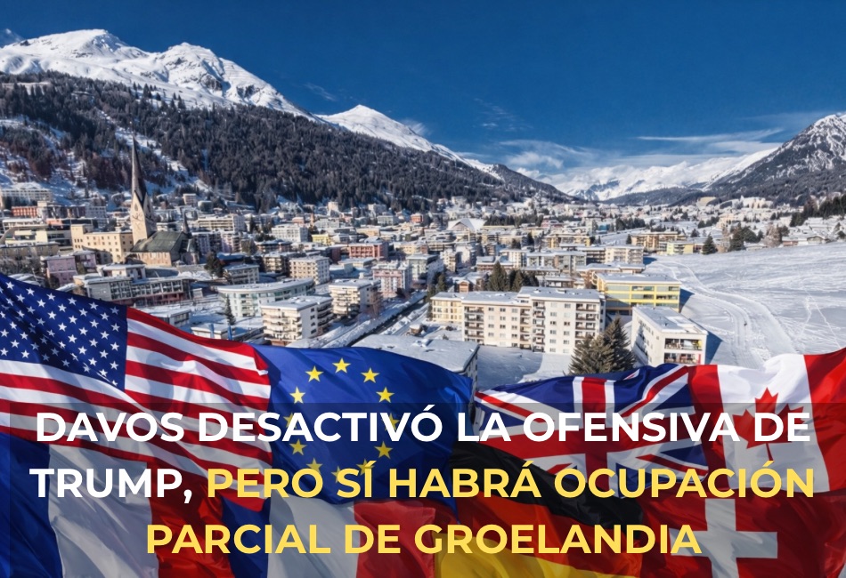 Vista aérea de Davos cubierto de nieve, sede del Foro Económico Mundial, con una composición simbólica de banderas de Estados Unidos, la Unión Europea, Canadá, Reino Unido, Alemania y Francia, representando las tensiones y negociaciones geopolíticas discutidas durante la cumbre.