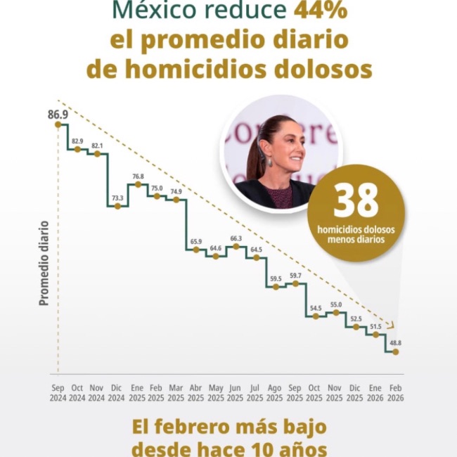 De acuerdo con los registros del SESNSP, el promedio diario de víctimas de homicidio doloso pasó de 86.9 casos diarios en septiembre de 2024 a 48.8 casos diarios en febrero de 2026. La diferencia equivale a 38 homicidios menos cada día en promedio. La variación entre ambas cifras corresponde a una disminución del 44 % en el promedio diario de víctimas de homicidio doloso durante ese periodo.